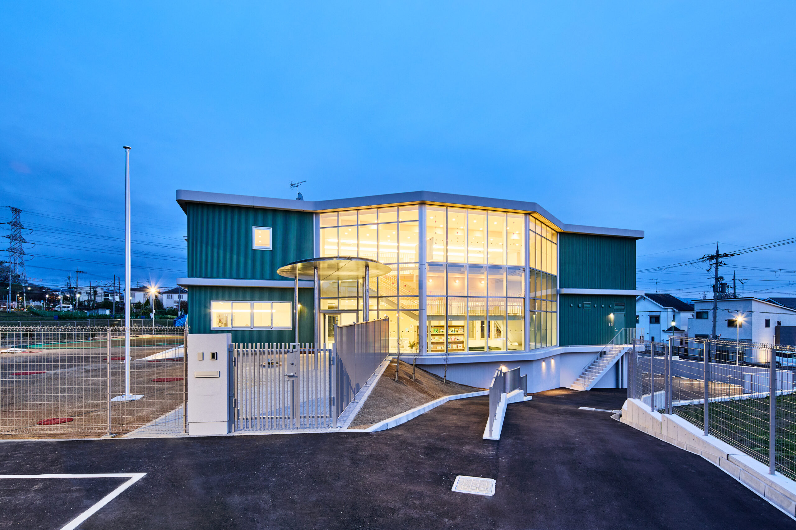 こちらの写真はブルーアワーに備えて1時間前から施設内を駆け回って照明をつけて撮影した1枚です。