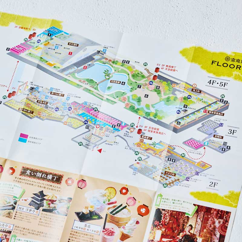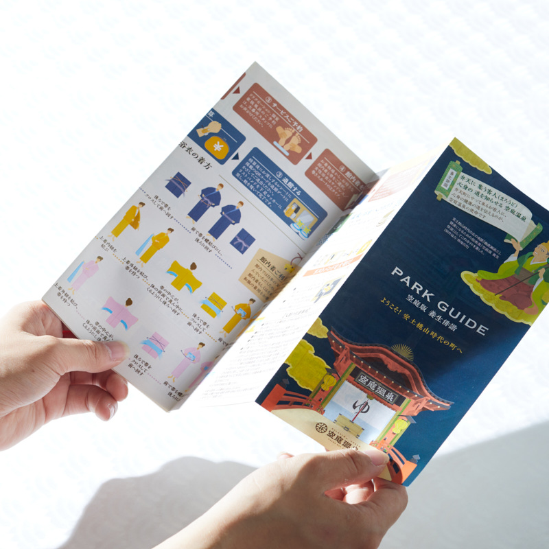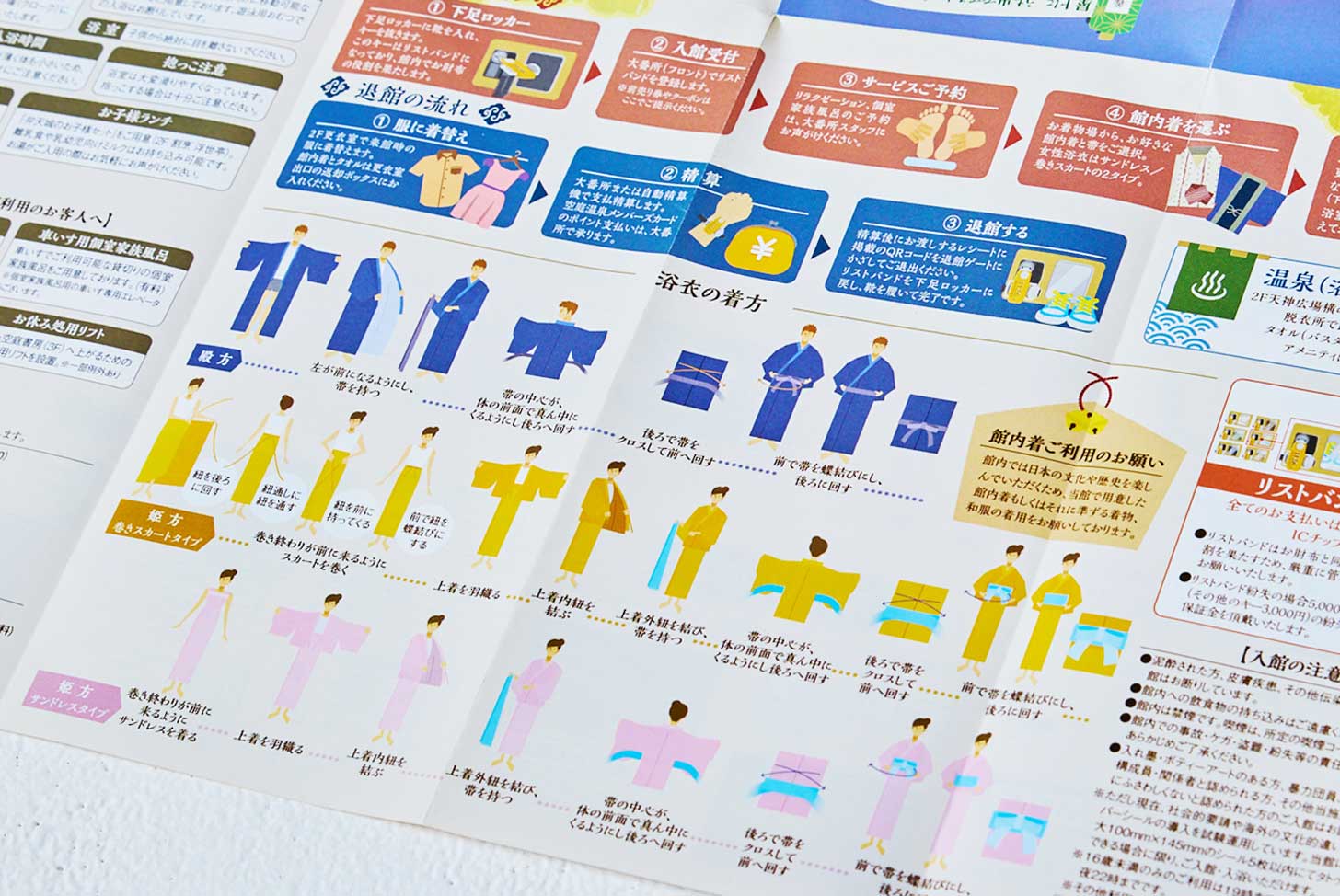 広い館内をくまなく案内する大切なガイドマップ。 テーマパーク全体の雰囲気を踏襲しつつ、誰にでも見やすいようにイラストのマップを作成させていただきました。 また外国人のお客様にも浴衣の着方が分かりやすいようにこちらもイラストを作成させていただきました。