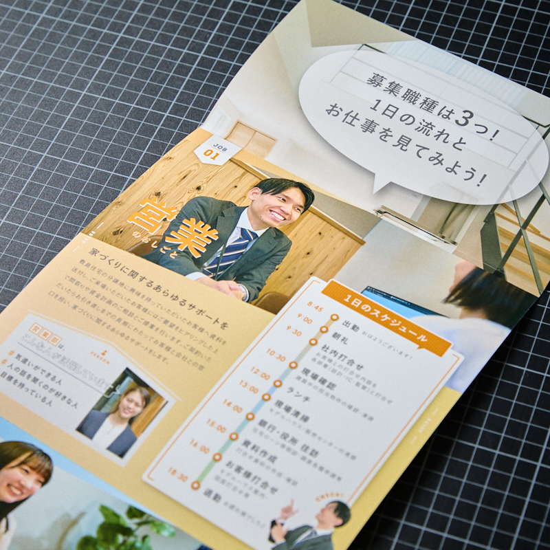 元々パンフレット制作をご依頼いただいていた敷島住宅株式会社様より、採用ツールも新たに制作したいとのご依頼をいただきました。各職種の仕事内容が分かりやすく、かつ一目見て会社の雰囲気が伝わるキャッチーな紙面にしたいというご要望をいただきました。