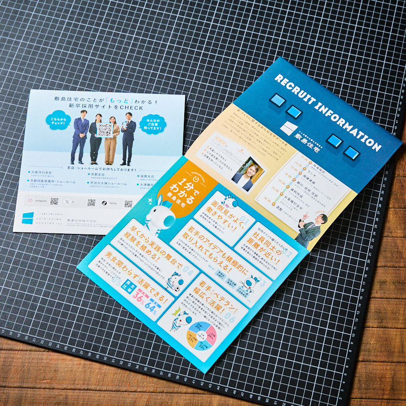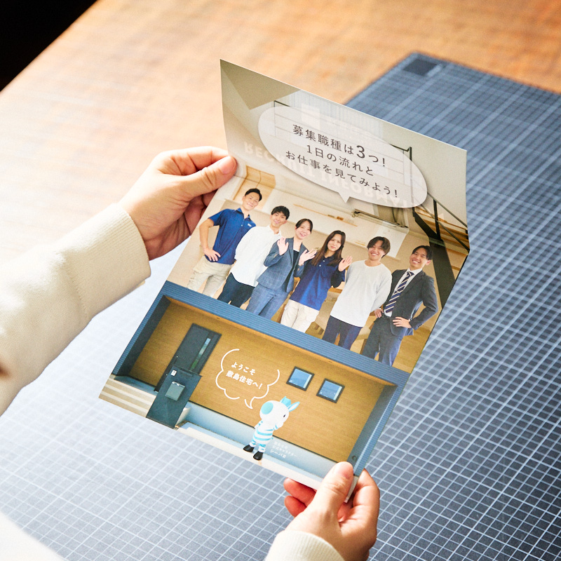 敷島住宅株式会社様のスタッフさまの雰囲気がよく伝わり、会社への理解度が高まるリーフレットに仕上がっていて、学生からの評判が良かったとのお声をいただきました。